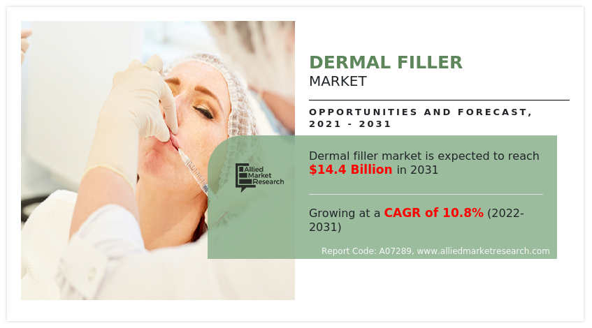 Dermal Fillers Market– Global Outlook and Forecast 2023-2030 is latest research study released by Allied Market Research evaluating the market risk side analysis, highlighting opportunities and leveraged with strategic and tactical decision-making support (2023-2030). The market Study is segmented by key a region that is accelerating the marketization. The report provides information on market research and development, growth drivers, and the changing investment structure of the Global Dermal Fillers Market. Some of the key players profiled in the study are AbbVie Laboratories, Bioxis Pharmaceutical, Cutera, Elan Aesthetics, Galderma, Merz Pharma, Revance Therapeutics, Sinclair Pharma, Teoxane Laboratories, Vital Esthetique Laboratories. The global Dermal Fillers market is projected to reach $14,418.4 million by 2031, registering a CAGR of 10.8% from 2022 to 2031.