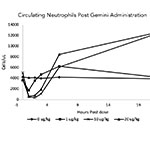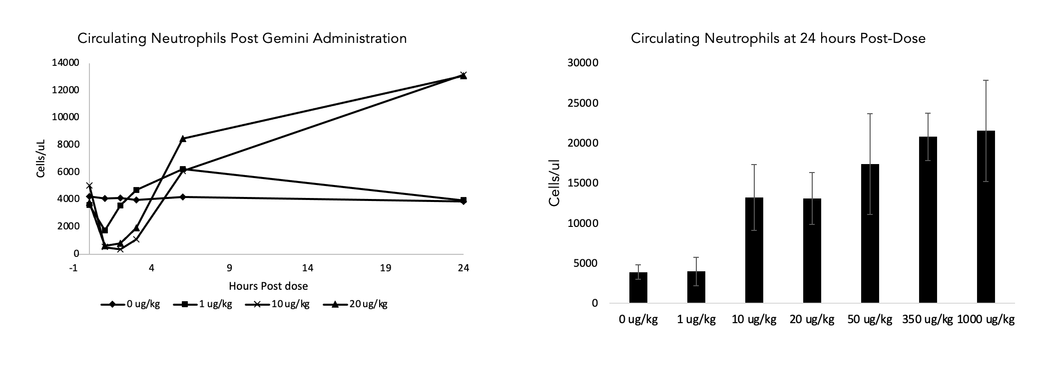 Upregulation of key biomarkers were observed in both rodent and non-rodent healthy animal preclinical studies. This included a dose dependent migration of white blood cells (neutrophils, monocytes, and lymphocytes) from the blood stream post dose with a subsequent rebound at 24 hours (data for neutrophils in non-rodent model shown in the figure below, n=3-10 per dose level examined). White blood cell mobilization and activation plays an important role in the prevention and resolution of bacterial infection.