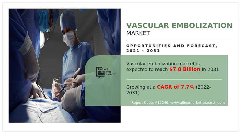 According to the report published by Allied Market Research, the global Vascular Embolization Market was estimated at $3.7 billion in 2021 and is expected to hit $7.8 billion by 2031, registering a CAGR of 7.7% from 2022 to 2031. The report provides a detailed analysis of the top investment pockets, top winning strategies, drivers & opportunities, market size & estimations, competitive landscape, and evolving market trends. The market study is a helpful source of information for the frontrunners, new entrants, investors, and shareholders in crafting strategies for the future and heightening their position in the market.
