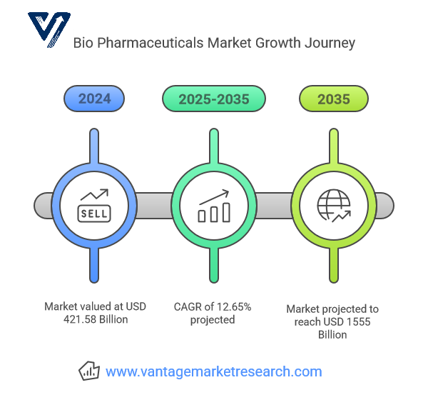 - According to analysts at Vantage Market Research, the global Biopharmaceuticals Market is valued at USD 421.58 billion in 2024 and is projected to reach a value of USD 1,555 billion by 2035, at a CAGR (Compound Annual Growth Rate) of 12.65% between 2025 and 2035