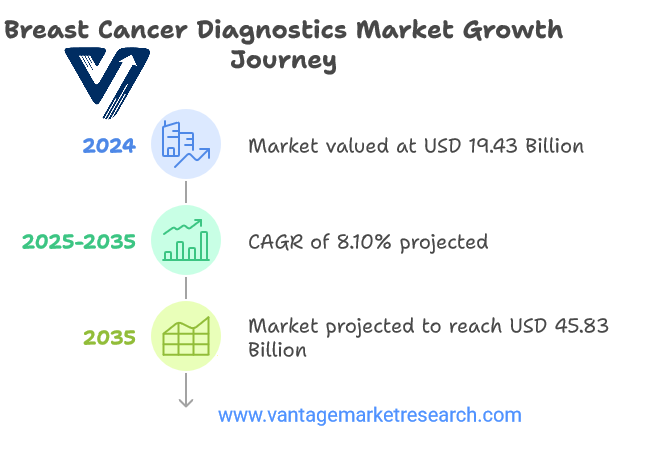 - Market Growth Trajectory: According to analysts at Vantage Market Research, the global breast cancer diagnostics market is projected to grow from approximately USD 19.43 billion in 2024 to USD 45.83 billion by 2035, reflecting a compound annual growth rate (CAGR) of 8.10%.
