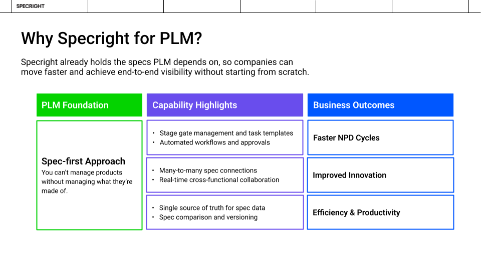 LOS ANGELES--(BUSINESS WIRE)--#AI--Specright, the leader in Specification Management, today announced new, expanded Product Lifecycle Management (PLM) capabilities tailored for the Food & Beverage (F&B) industry. Building on its spec-first approach, Specright now delivers a modern, AI driven, PLM solution that manages what products are made of—formulas, ingredients, packaging, and bills of material—helping brands accelerate innovation while ensuring compliance, sustainability, and quality.