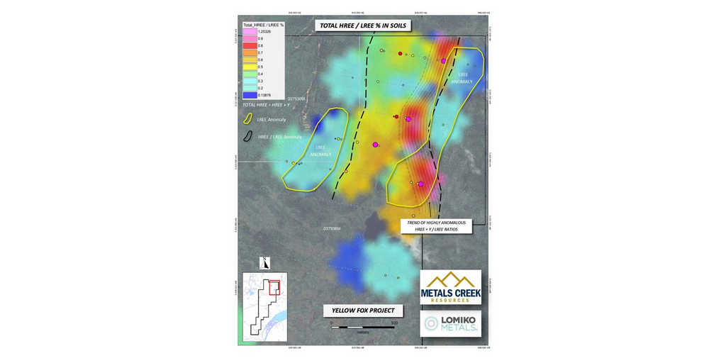 These results are from additional REE analysis from the Phase II soil sampling and prospecting program (See News Release September 23, 2025) on the Yellow Fox Antimony property and follow-up to the initial 7 samples assayed for REE’s (See News release January 14, 2026). Lomiko acquired the Yellow Fox Project from Metals Creek in 2025. (See MEK news release dated January 21st, 2025).